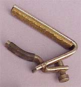 Washburn Beautiful cast brass capo with hinged bar. Note the scroll. Probably leather padding. From the 1889 Washburn catalog: Brass with Adjustable bar.............................$1.00 Brass, Nickel Plated with Adjustable Bar.....$1.25 US patent in 1888 by George D Moffat. (Moffat's capo patent has the hinged bar, but instead of a screw it has an eccentric lever.) |